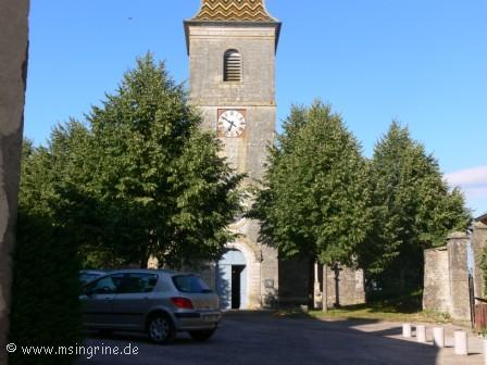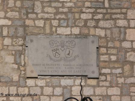 Oben am Turm befindet sich eine Gedenktafel zum 25. Hochzeitstag von Hubert de Salverte und Gabrielle de Marmier , erinnert an den 8. April 1956.