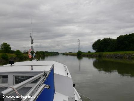 In Saint Jean de Losne haben wir an der Flusstankstelle unseren Dieselvorrat aufgefüllt, der Preis war auch in Ordnung, an einer deutschen Tankstelle wäre es wesentlich teurer geworden. Danach ging es vorbei an der Ancienne Ecluse Richtung Zuführung zur ersten Großschleuse auf unserer Strecke. Die Zuführung ist etwa 9,5 km lang und fast schnurrgeradeaus, erst kurz vor der Schleuse selber gibt es auf dem letzten Kilometer eine Biegung. Das letzte Drittel ist zudem geprägt von den Spundwänden, die hier das Ufer des Kanales bilden, man muss das eben erdulden.