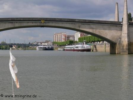 Durch die Pont Saint Laurent hindurch konnte man eine Hotelschiffe an den für sie reservierten Anlegern sehen.