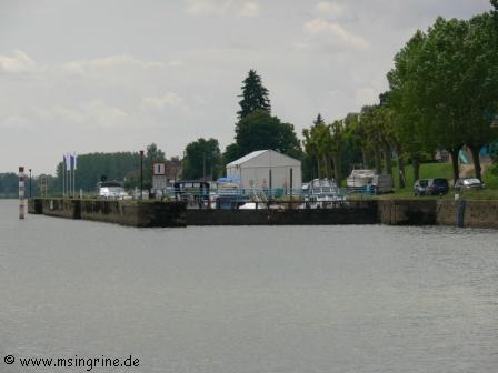 Die Schleuse von Ormes kommt in Sicht, sie liegt etwa 5 Km unterhalb der alten Schleuse von Gigny. Blinklichter warnen einem davor, rechts über den Damm zu fahren, der hier unmittelbar an der Schleuse liegt.