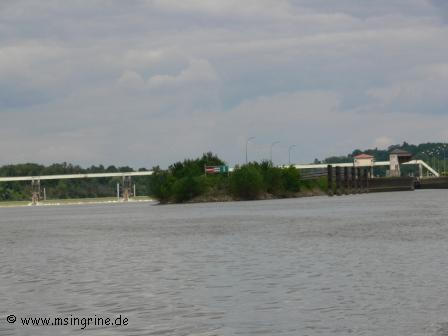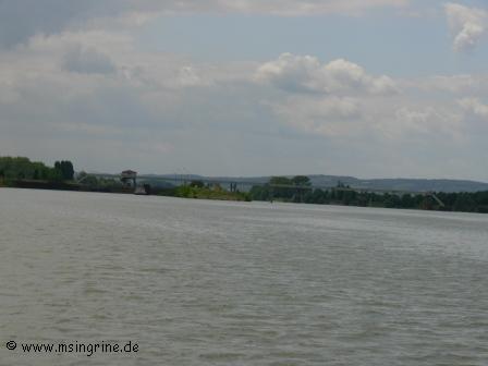 Vom Unterwasser kann man die Anlage besser übersehen. Man beachte die Tafeln hier vor der Zufahrt zur Schleuse: bei Hochwasser ist die Schleuse außer Betrieb, dann führt der Weg über den Staudamm herüber.