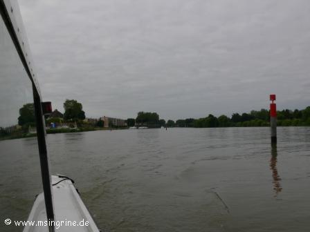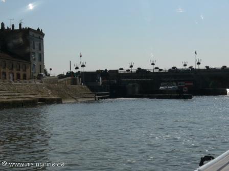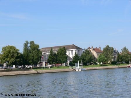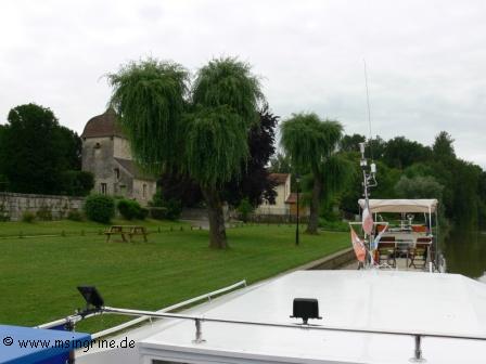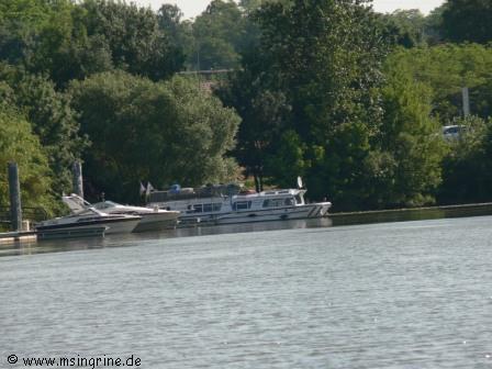 Auf der Saône war es recht ruhig, wenig Boote. Selbst hier am Anleger in Pontailler sur Saône war nichts los. Hier musste ich kurz anlegen, da ich Hydraulikflüssigkeit für die Lenkung nachfüllen mußte. Beim Ablegen bekam Helga die Achterleine nicht rechtzeitig los, sie hatte sich verfangen. Das Boot war aber bereits von der Strömung erfasst worden und ich konnte es nicht mehr parallel zum Ufer halten. Der Bug der Ingrine wurde von der Strömung mitgerissen und wir drohten mit dem Heck vor die Mauer zu knallen. Ich konnte durch Vorwärtsfahrt den Aufprall vermindern, aber es hatte dennoch gut gerumst. Das hätte böse ausgehen können.