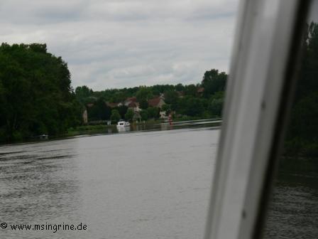 Vor uns war seit Auxonne ein einzelnes Boot, hier vor der Schleuse in Warteposition. Allerdings waren die etwas nervig, sie fuhren ständig vom rechten zum linken Ufer und zurück, da sie während der Fahrt am Angeln waren und die besten Stellen unter den Bäumen mitnehmen wollten. Ich habe dann nach der Schleuse bei geeigneter Stelle mein Überholmanöver eingeleitet und zur Sicherheit kurz das Horn betätigt, damit sie nicht plötzlich wieder einen Haken schlugen.
