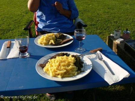 Der Grill war auf dieser Tour ziemlich zu kurz gekommen, also gab es etwas für auf die Glut. Im Gefrierschrank war genug vorhanden, als Beilage gab es etwas italienisches.