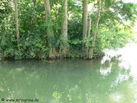Für die Mittagspause wollten wir einen Stopp einlegen, aber die wenigen guten Plätze waren bereits anderweitig belegt. Ich bin dann mit einer Schiffslänge in die Mündung der Salon eingefahren, die zwar sehr schmal, dafür aber gut zwei Meter tief ist.