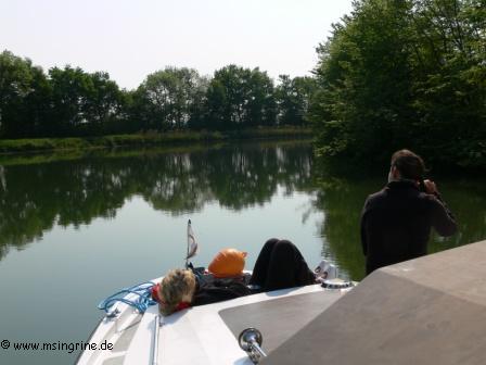 Die ersten Eindrücke vom bevorstehenden Tag ließen Gutes erahnen. Ich hatte den Tauen ein wenig Spiel gegeben, aber das Boot lag so ruhig, als ob der Fluss keine Strömung hätte. Ziemlich ruhig auf dem Wasser, keine Boot weit und breit. Auf der Dérivation von Vereux kam uns dann das erste Boot entgegen. Schallsignal geben und sachte um die Ecke. Ein Fischreiher am Ufer hatte da eher etwas anderes vor. Wir mussten einen kurzen Moment warten, da uns wohl doch ein Boot gefolgt war. Und dann war es mal wieder vorbei, die Ingrine ging rückwärts in die Box an ihren Platz, Festmacher raus, Strom anschließen. Aufräumen, klar Schiff und zurück nach Düsseldorf. War ein sehr schönes Osterwochenende, Wiederholung ist geplant . . . |