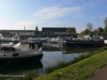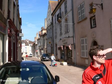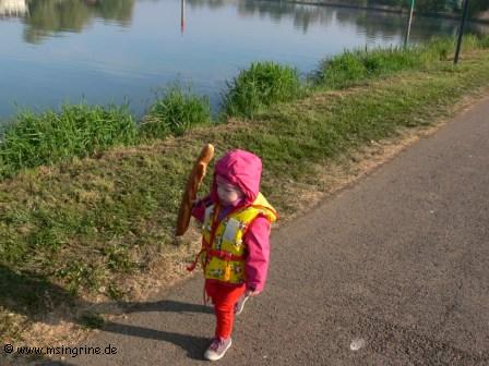 Tag 4 So 20.4.2014 Sonnenschein für die Rückreise Heute ist es nun leider so weit, Ingo und Denise müssen zurück nach Deutschland, Ingo hat am Folgetag Frühschicht. Der Tag zeigte sich bereits am Morgen von der besten Seite, in der Ferne lag über der Saône leichter Nebel, es schien als ob die Tonnen in der Luft schwebten. Helga machte sich auf um frisches Brot für das letzte gemeinsame Frühstück zu holen. Ingo war am Land unterwegs gewesen und holte Mira nach, da er eine Ente mit Jungtieren entdeckt hatte. Der Vater der kleinen Familie saß auf der anderen Seite in der Wiese um von den Küken abzulenken. In der Zwischenzeit war Helga mit dem Brot zurück und Mira wollte unbedingt tragen helfen. Es steckt halt in jedem ein kleiner Franzose. Hier ein Bild von der Ingrine im Hafen von Auxonne, nur wenige Plätze neben der Hazelwood von Roy und Carol. Vor der Rückfahrt wollten Denise und Ingo noch in die Stadt für eine kleine Erkundung, das Wetter war ja auch prächtig und bis Mittags hatten sie noch Zeit. Also sind wir alle zusammen für einen kleinen Rundgang in die Stadt gegangen. Wir kamen auch pünktlich zur Ostermesse auf dem Kirchplatz an, die Glocken läuteten von beiden Türmen und die Kirchenbesucher sammelten sich auf dem Vorplatz. Die in den letzten Jahren renovierte Fassade erleuchtete im Sonnenlicht, ein schöner Anblick. Denise und Helga wollen noch schnell in einen Supermarkt springen, derweil bin ich mit Ingo und den Kindern in den kleinen Park an der Porte de Comté um uns die Zeit zu vertreiben. Mira musste natürlich die kleine Treppe an der Seite erklimmen. Durch die Rue Emile Gruet und die Rue Antoine Masson ging es dann die Hauptstraße herunter an die Saône. Jetzt zur Mittagszeit waren auch einige Boote am Stadtsteg, vielleicht auch nur zur Mittagspause. Dann kam der Abschied. Mira wurde befragt und wie an den Vortagen auch wollte sie noch gerne bei uns auf dem Boot bleiben, wir hatten ja noch einen Tag mehr Zeit. Ich bin dann mit Denise und Ingo nach Savoyeux gefahren, um mein Auto zu holen. Danach habe ich die Beiden zur Autobahn gelotst und bin selber über die Autobahn nach Auxonne gefahren, ca. 45 Min. Fahrt und ich war dort. Zum Abend hin sind wir dann noch spazieren gegangen, Enten gucken, Blumen riechen und natürlich Pusteblumen pusten. Am Wegesrand und an den kleinen Wiesen neben dem Feldweg gab es so viele bunte Blumen, die mussten auch gepflückt werden. Dann spielten wir noch im Boot, ein Stück Isolierband musste als Pflaster herhalten und Mira klebte sich das Pflaster an die unmöglichsten Stellen, obwohl sie zuerst gar nicht von Pflastern angetan war. Dann ging es ab in die Kiste, morgen ist auch noch ein Tag. |