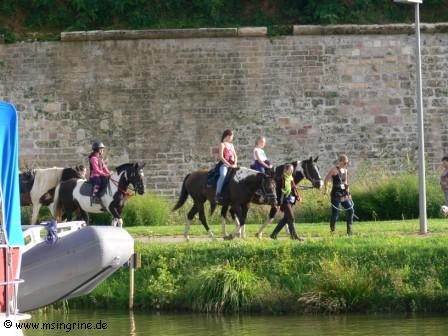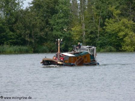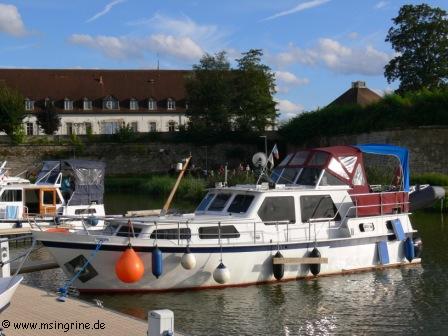 Das Wetter versprach uns eine gute Zeit, es war sehr warm, teilweise schon zu warm, aber nicht drückend. Wie am Vortag brannte die Sonne bereits gnadenlos, sodass ich beschloss, hoch zum Grillplatz in den Schatten unter die Bäume zu fahren. Der Platz war zum Glück nicht belegt und das Anlegen ohne Hilfe war durch die geringe Strömung ein Kinderspiel. Gegen 13°° kam ein Boot vorbei, wobei der Steuermann in einem Stuhl oben auf dem Dach saß, per Leine wurde das Steuerrad von oben bedient, wie man auf anderen Fotos besser erkennen kann. Auf dem anderen Ufer der Saône war am Bootsklub eine Ferienfreizeit untergebracht, die an diesem Tag mit einer Pferdegruppe unterwegs waren und am Hafen vorbei gekommen sind. Da war viel Lärm und Lachen zu hören. Ich war etwas früher am Flughafen eingetroffen als ihr Flieger ankam, denn ich wollte noch ein paar Fotos vor Ort machen. Ich war auch nicht der Einzige, der diese schöne alte Maschine bewundern tat. Immer wieder kamen Besucher auf die Aussichtsterrasse, um die Maschine zu bestaunen. Nur knapp 4 Minuten nach der planmäßigen Zeit rollte Helgas Flieger vom Taxiway auf das Vorfeld Richtung Terminal. Wenig später kam sie diesmal aus dem richtigen Ausgang "France" heraus und musste ein paar Minuten auf mich warten, da ich noch oben auf der Besucherterrasse war. Danach ging es dann zurück Richtung Auxonne, wo das vorbereitete Abendessen bereits auf uns wartete. Vor Ort überraschte ich Helga noch mit der Nachricht, dass ich mich am Vortage mit Roy darauf geeinigt hatte, den Platz im Hafen dauerhaft zu behalten. Damit hatte die Ingrine ein neues Zuhause. |
